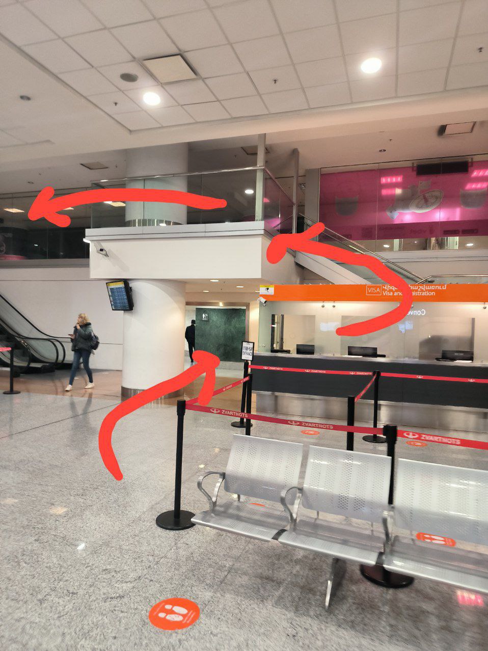 Пост транзита на втором этаже, рядом с спуском на первый. Если нет багажа то могут пропустить. Мы летели 2 декабря на Питер, билеты разные, багажа не имели. Подошли, спросили они кому то позвонили и нас пропустили и мы были такие не одни.