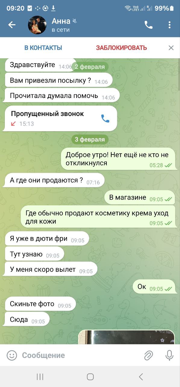 Девочки будьте окуратны мошеники. Вчера разместила в чате кто может 2 крема на Кипре или в дути фри купить и в питер привести. Вот сегодня девушка откликнулись. Прислала фото что нашла мой крем в дути фри ждёт денег от меня. Хорошо я зашла в интернет и набрала фотографий этой косметики. И ту фота которыю она мне выслала я сразу увидела в интернете.
