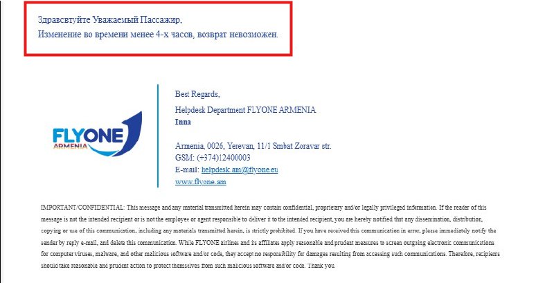 Flyone перенесли время полета, хочу вернуть билет (билет возвратный). Но мне не возращают и прислали вот это письмо. Подскажите пжл, кто-ниубдь сталкивался с такой проблемой?
