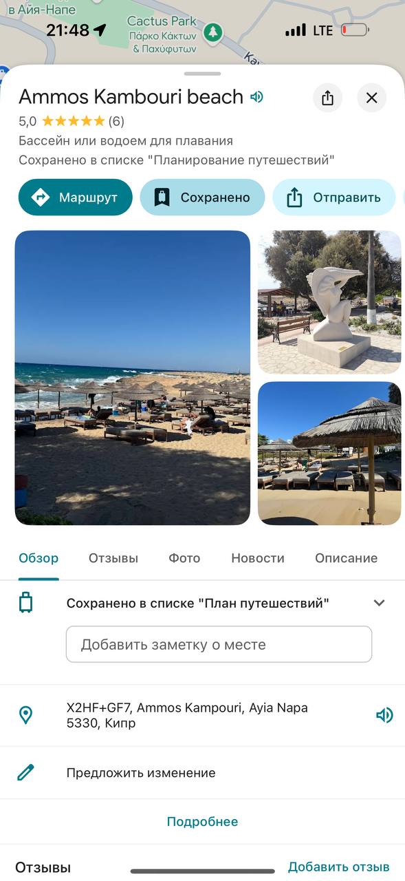 Немного не в тему, но этот пляж мне показал друг грек и это теперь мой любимый пляж! Очень хорошие лежаки, мало людей. Есть кафе с сендвичами. И именно на этом пляже быть лучше с маской и желательно хорошей. Очень много рифов и в воде просто уйма живности, не так как на других пляжах. Если любите «вайбовые» места, то этот пляж вам точно зайдет) Недалеко от айя напы