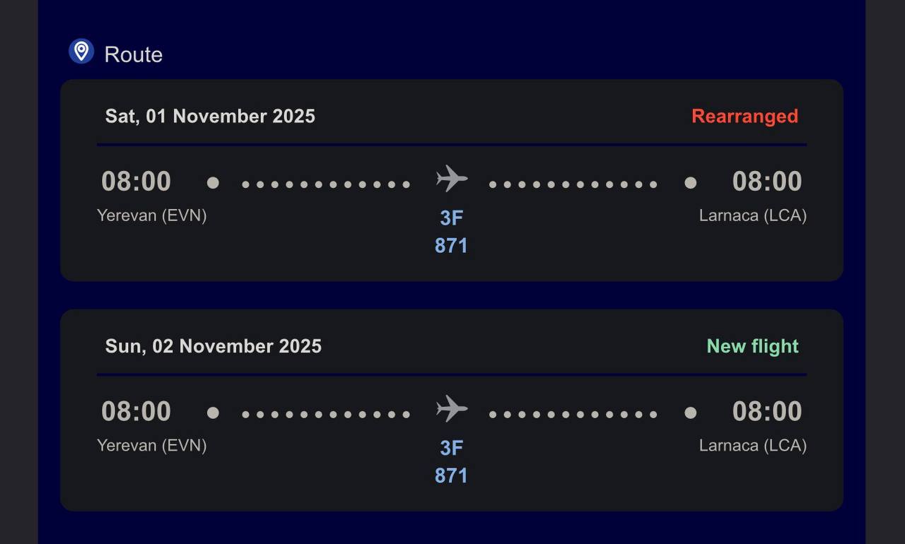 Добрый вечер. Покупал перелет FlyOne через Ереван с пересадкой там 1,5 часа без повторной регистрации. Рейс поменяли и теперь ночная пересадка увеличилась до 10 часов. Придется выходить в город переночевать.