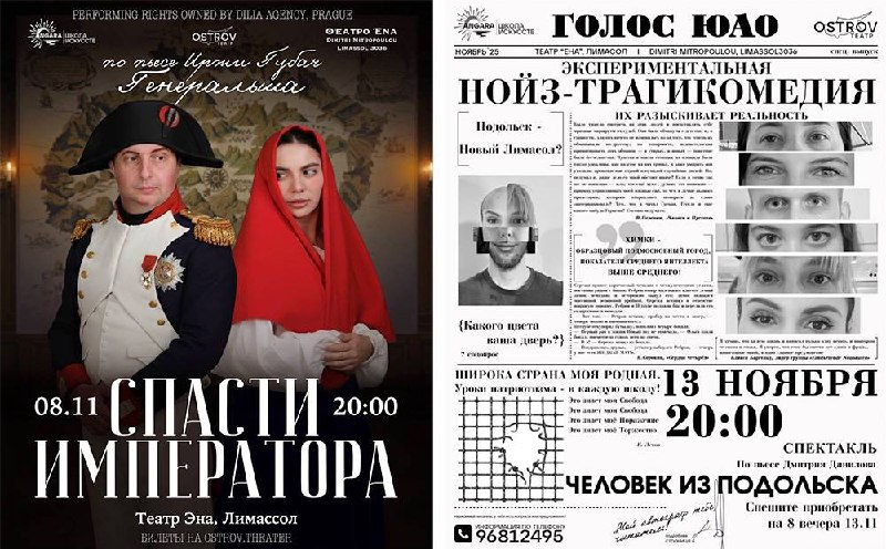 В ноябре театр представит в Лимассоле две пьесы, которые точно не оставят зрителей равнодушными. 8 ноября — премьера сатирической комедии «Спасти Императора», лиричная и ироничная история о Наполеоне, ищущем смысл жизни на острове Святой Елены. А 13 ноября — «Человек из Подольска», остросюжетная постановка по пьесе Дмитрия Данилова, где смешное соседствует с тревожным и абсурдным.