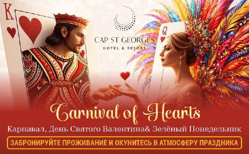 Проведите три дня, в которых романтика Дня святого Валентина переплетается с яркой и беззаботной атмосферой карнавала. Cap St Georges Hotel & Resort приглашает гостей на особенное событие – Carnival of Hearts, созданное для тех, кто любит праздники с характером и настроением.