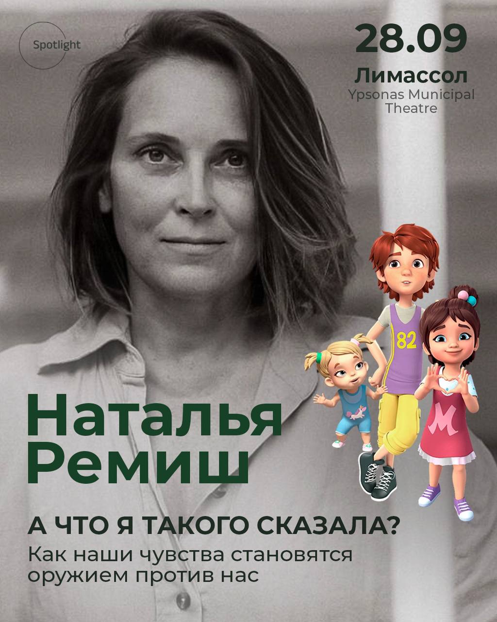 В воскресенье, 28 сентября, в Лимасол приедет Наталья Ремиш @natalia.remish — автор книг «Просто о важном» и «Куда уходят чувства?», создатель анимационного фильма «Про Миру и Гошу», эксперт по эмоциональному развитию.