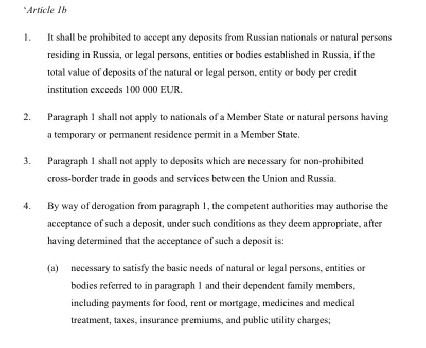 1)ЕС объявил запрет россиянам размещать в банках более 100 000 евро. То есть сейчас никто из рф не может хранить в банках более 100к? А что будет аккаунтами которые уже открыты с депозитом более 100к?