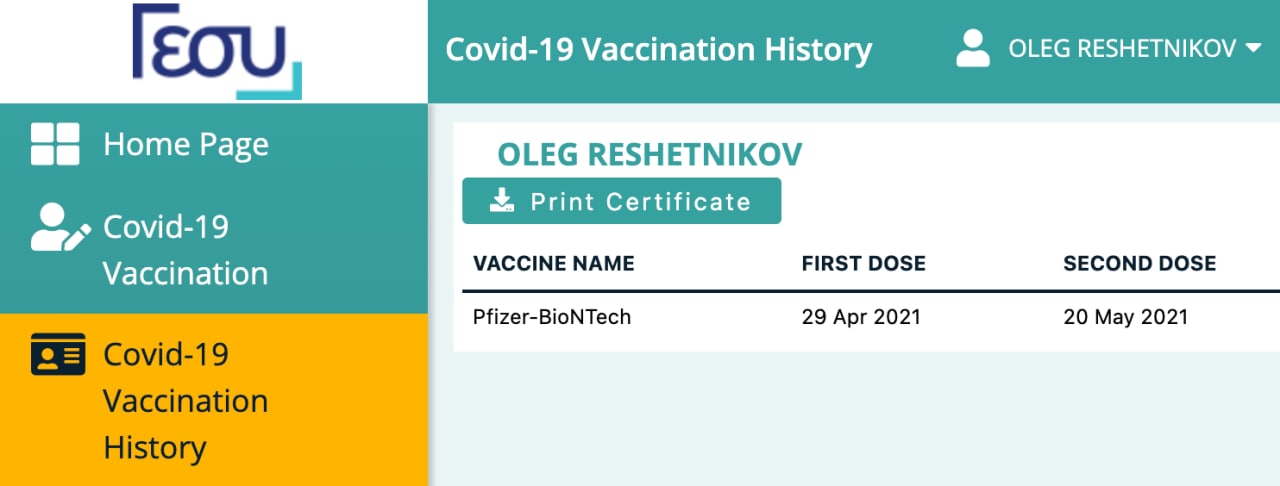 В Портале вакцинации появилась возможность посмотреть историю своей вакцинации и скачать электронный вариант сертификата вакцинации (на английском и греческом языках).
