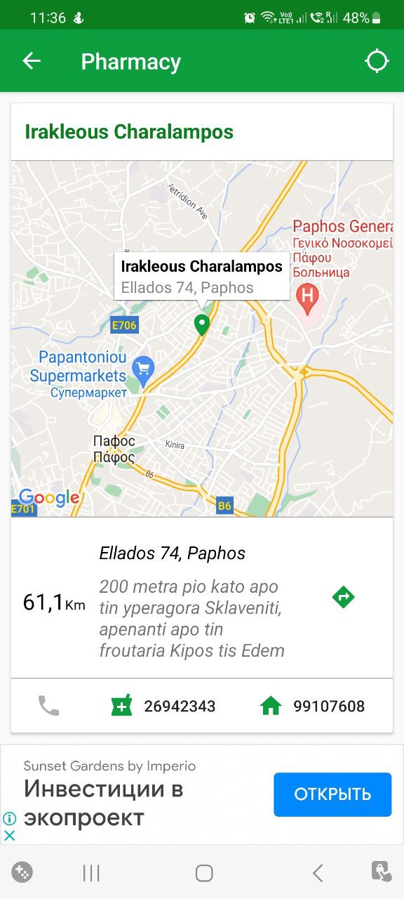 Добрый день. Не могу найти приложение, которое показывает дежурные аптеки. Можнт кто то подскажет какая аптека в пафосе сегодня дежурная?