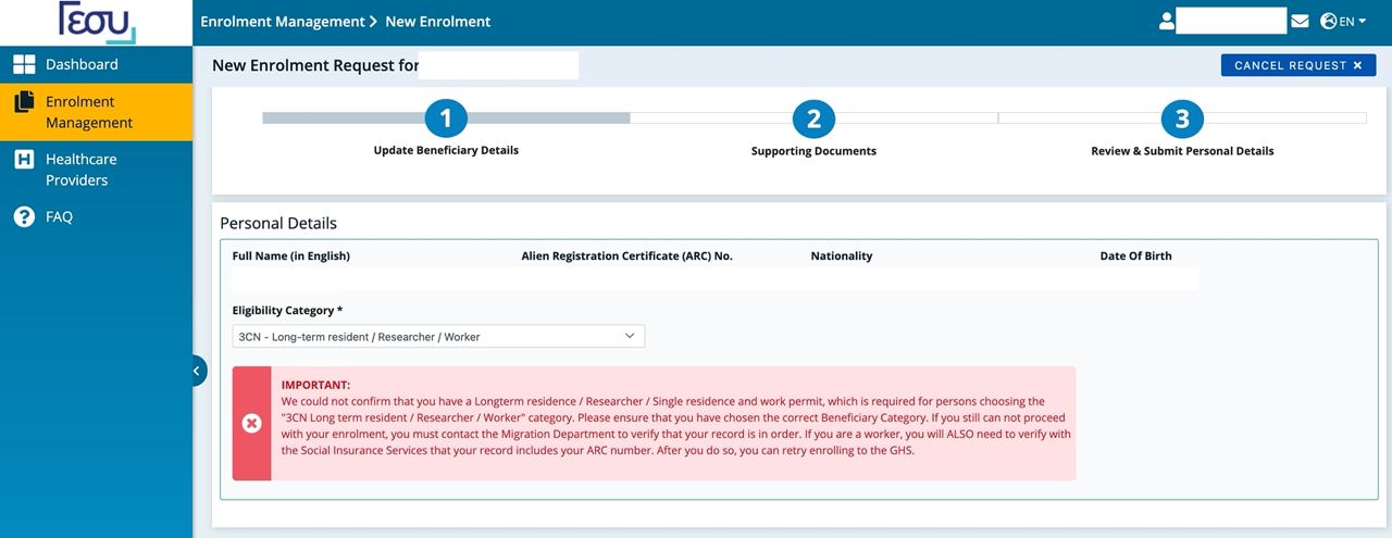 Добрый день, переехал работать на Кипр в декабре. Сейчас решил зарегистрироваться в Геси. Завел учетку на сайте, начал enroll, ввел свои данные и ARC, при выборе категории выскакивает такая ошибка. Может быть, кто-то сталкивался с таким и что-то подскажет? Спасибо.