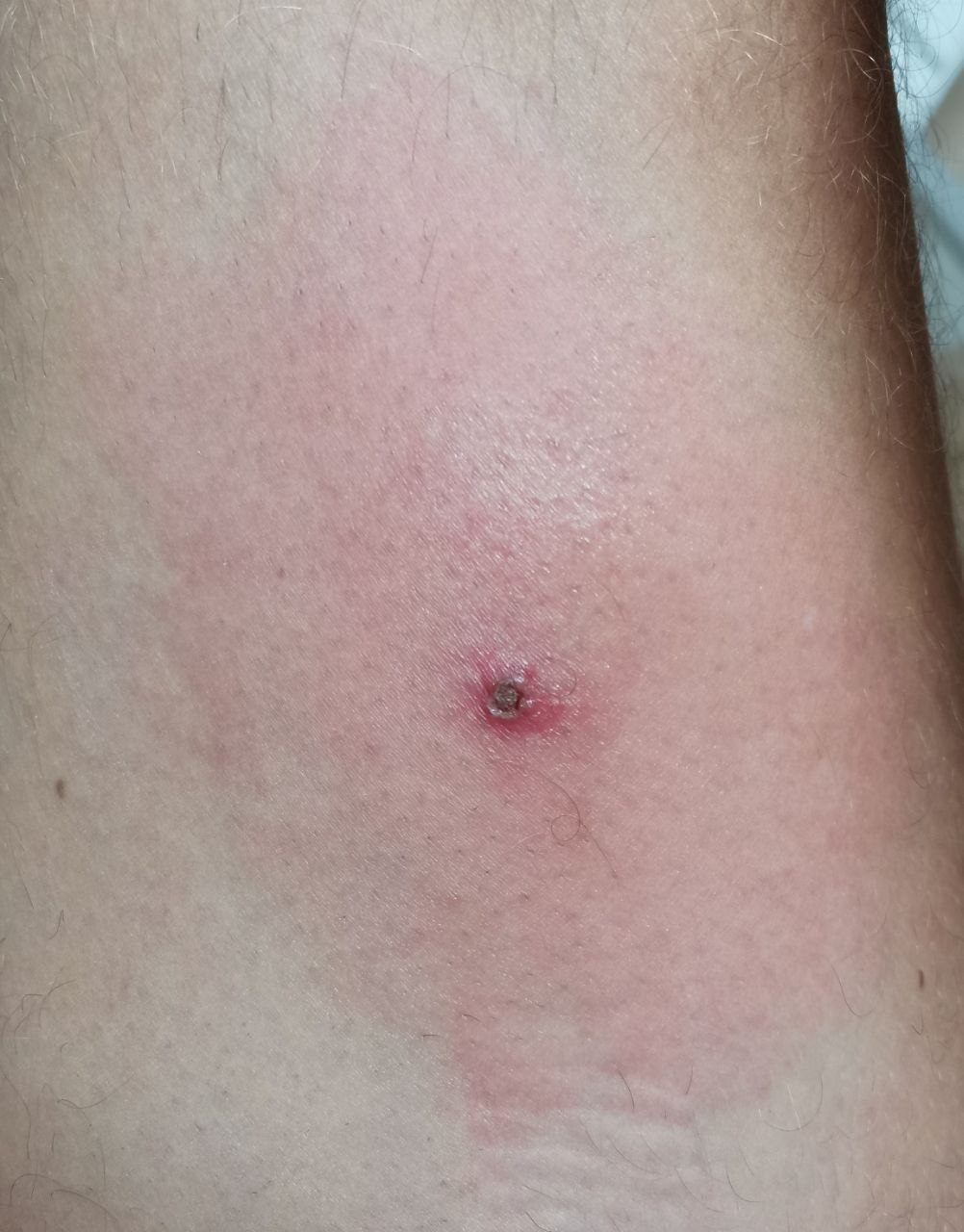 Товарищи, может кто сталкивался? Укусила какая то дрянь два дня назад непонятно где и даже не чувствовал. Возможно ночью. За вчерашнюю ночь образовалась натуральная дырка в ноге, ощущение что это из-за разрушения тканей вместе укуса и вокруг небольшой красный ореол. За сегодня дырка заросла но ореол сильно растекся. Вчера просто зудело но к вечеру начало болеть. Я в принципе не алергичен, антигестаминные как будто особо не меняют картины. Пятно на ощупь горячее. Что это может быть?