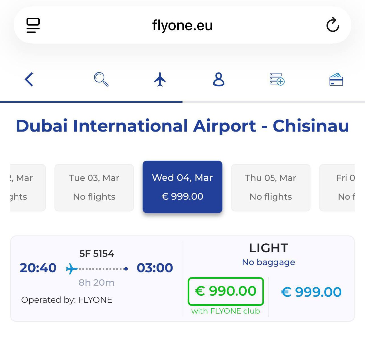 У FlyOne сейчас есть билеты по маршруту Дубай - Кишинёв на 4 марта. Цена - от €999, причём это тариф без багажа. Да, билет очень дорогой, но в нынешней ситуации на Ближнем Востоке кому-то такой вариант может оказаться действительно нужным.