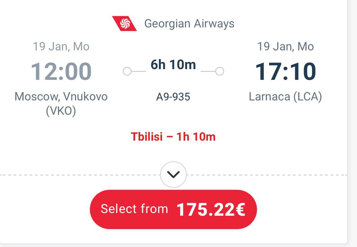 Например, по такой цене есть билеты на 19, 20, 21, 22, 23, 24, 25, 26 января. Пересадка в Тбилиси 1 час 10 мин.