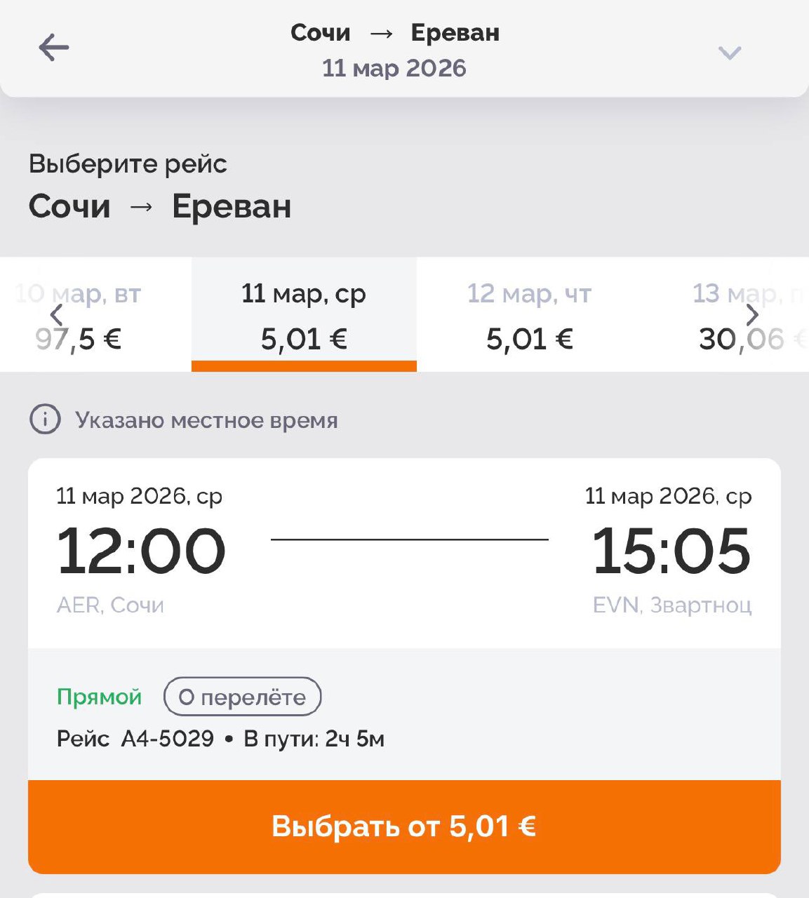 Авиакомпания «Азимут» предлагает удивительные цены на билеты из Сочи в Ереван на некоторые даты в период с января по май.