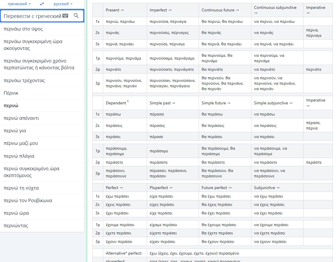 https://ru.glosbe.com/%D1%81%D0%BB%D0%BE%D0%B2%D0%B0%D1%80%D1%8C-%D0%B3%D1%80%D0%B5%D1%87%D0%B5%D1%81%D0%BA%D0%B8%D0%B9-%D1%80%D1%83%D1%81%D1%81%D0%BA%D0%B8%D0%B9/%CF%80%CE%B5%CF%81%CE%BD%CF%8E кто-нибудь пользуется этим переводчиком? там в грамматике есть все формы глаголов
