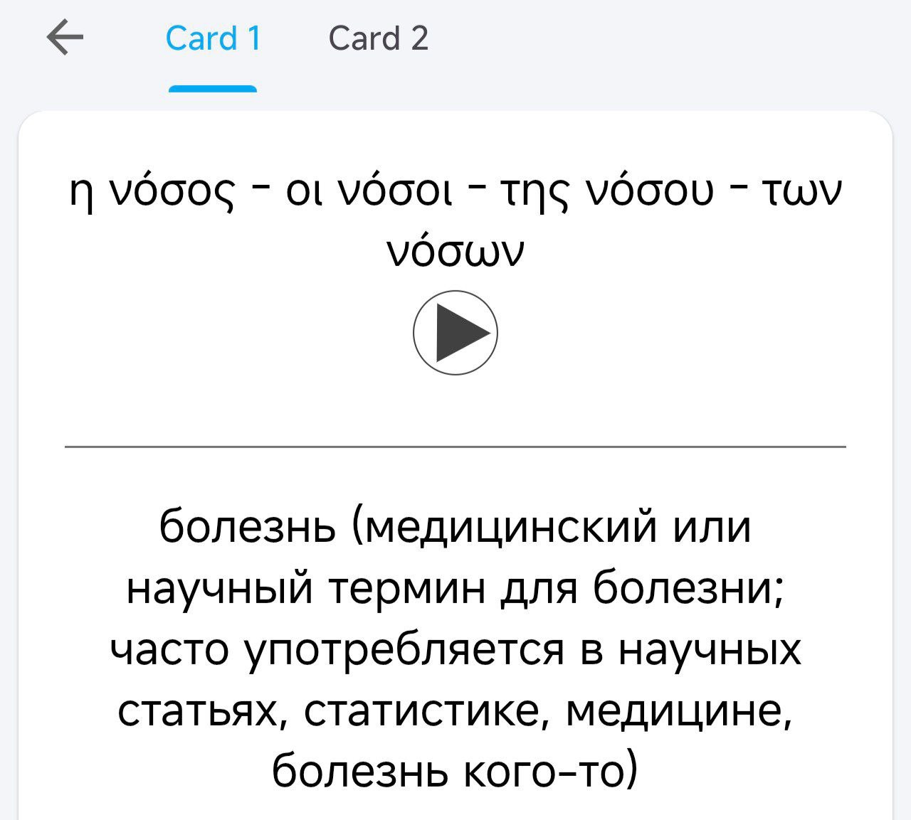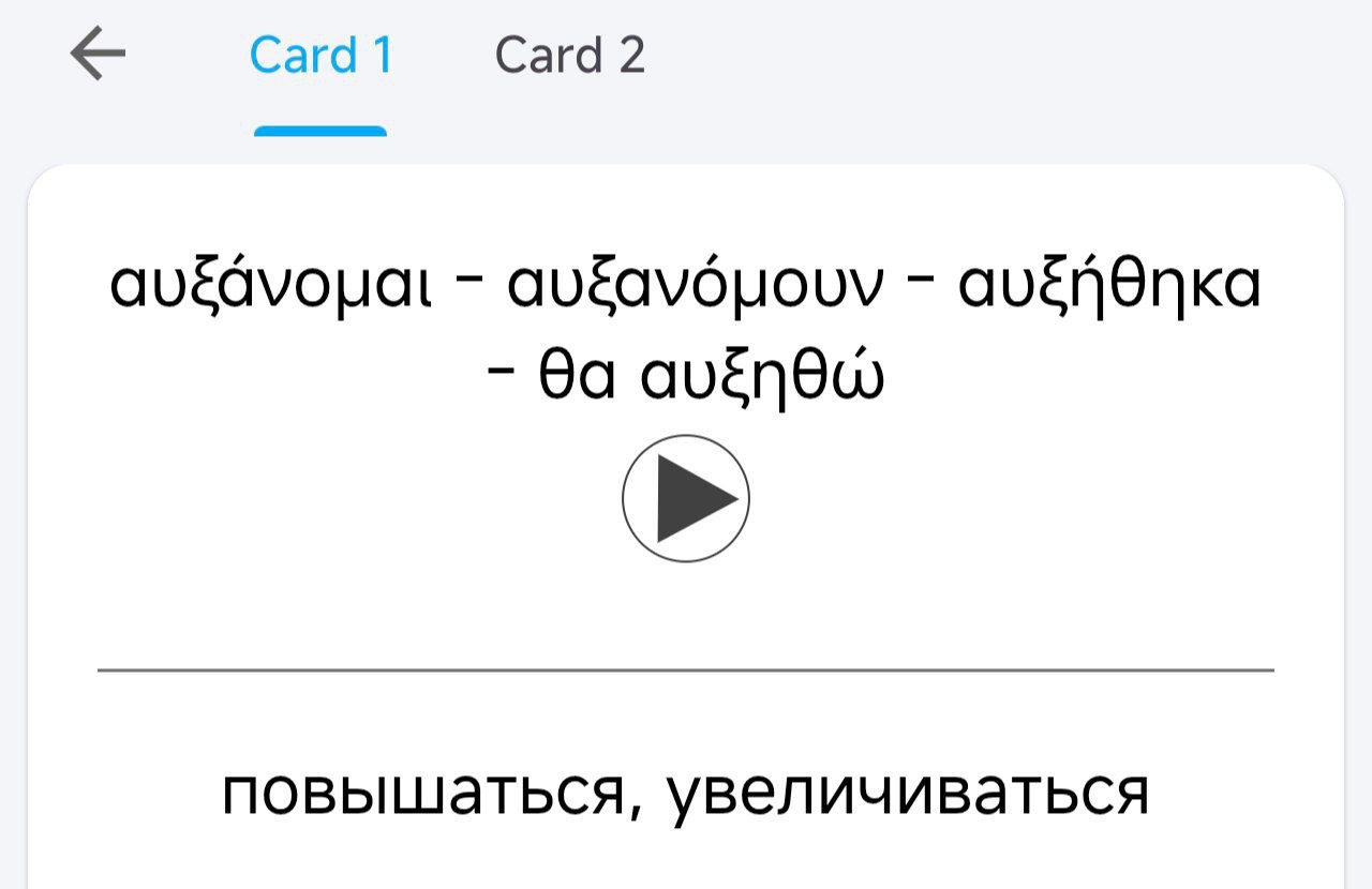 По итогу получаем на каждое слово по 4 карточки: две на само слово (с русского на греческий + с греческого на русский) + две на пример.