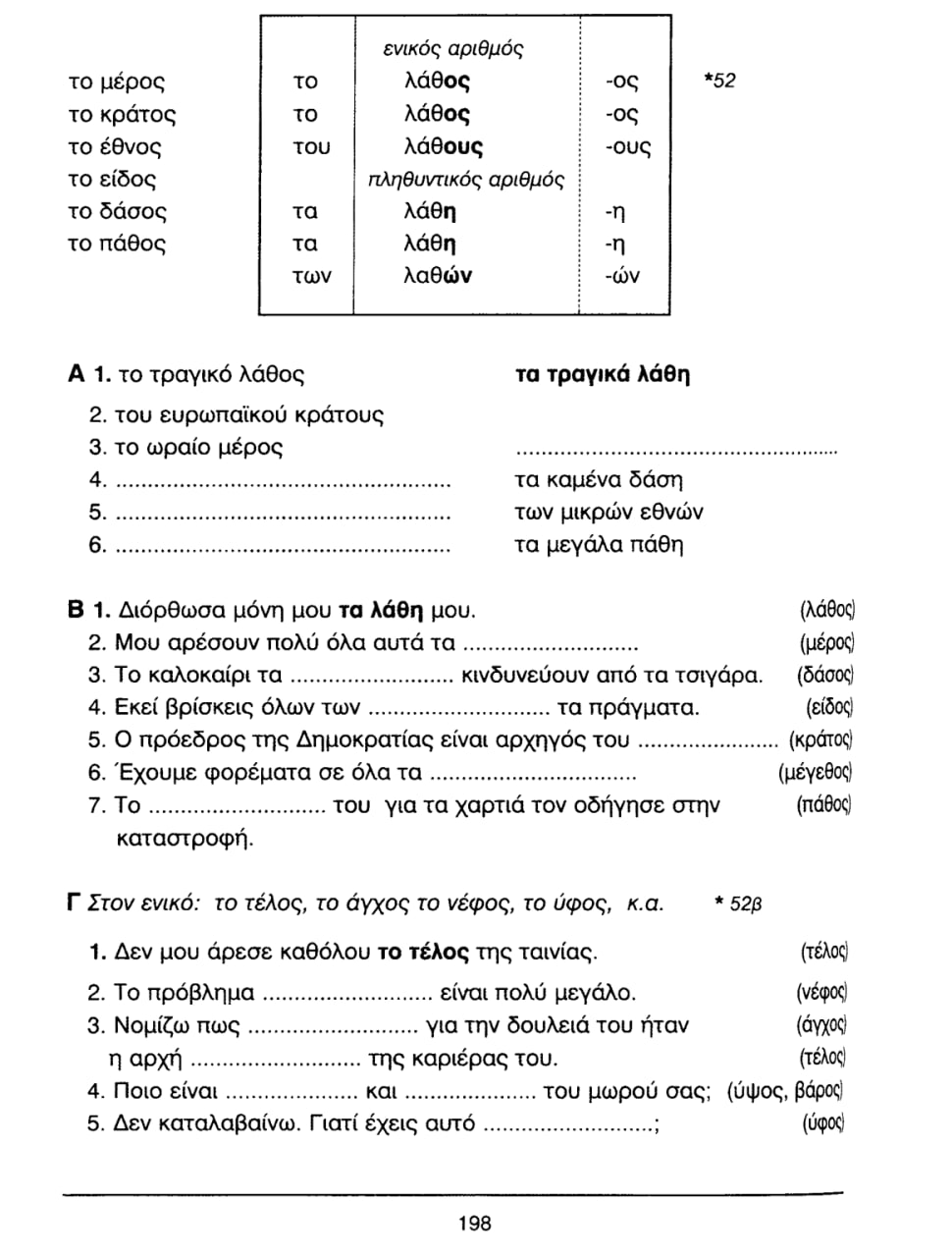 И из того же учебника - материал по существительным-исключениям с мужским окончанием -ος, но среднего рода (чувствую, что тут у кого-то могут сжаться кулачки и может возникнуть желание придушить автора публикации 😆 но я из лучших намерений, видит Бог: коль зашла речь, как не вспомнить, что есть и такая группа неправильных существительных)