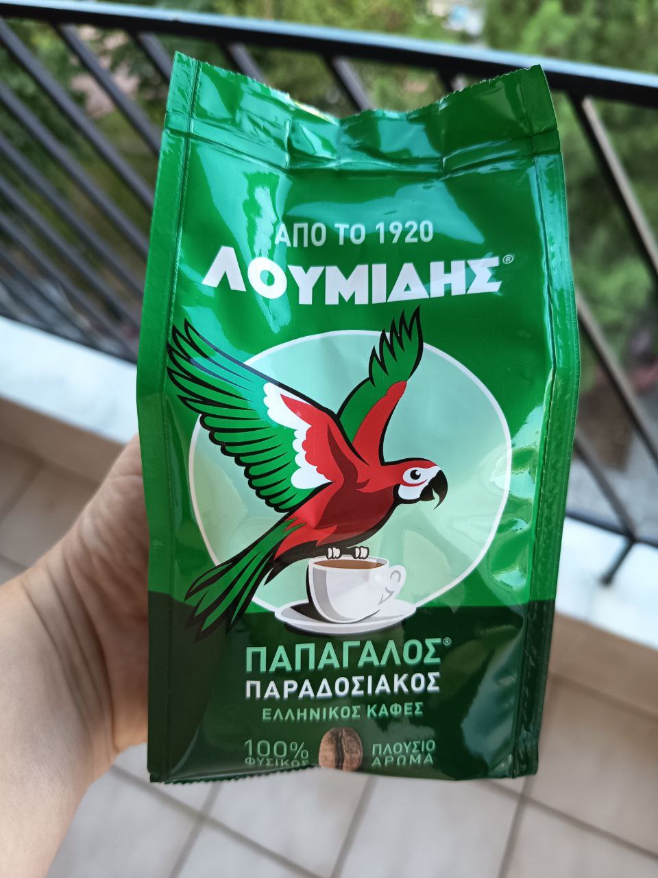 Если вы бывали в Греции, наверняка замечали в магазинах кофе Λουμίδης. Его легко узнать по зелёной упаковке с попугаем 🦜.