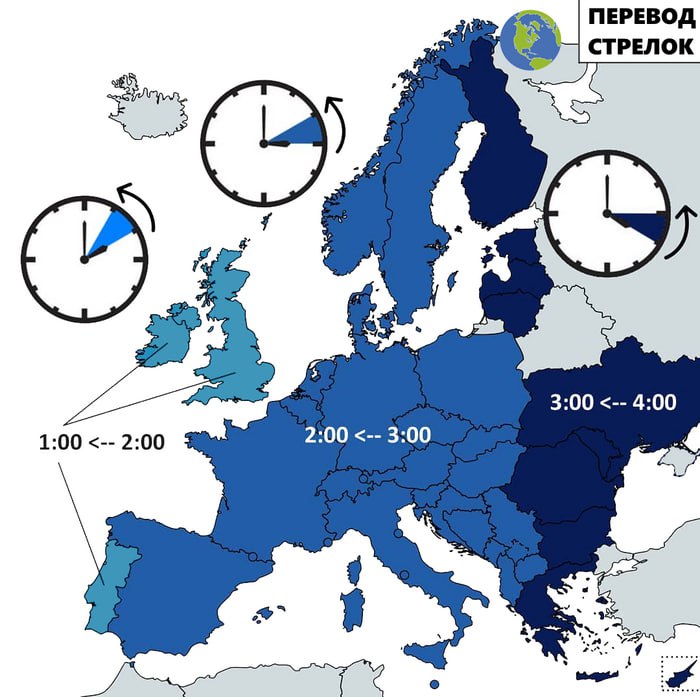 Из стран Европы не переводят часы с зимнего на летнее время и обратно только 🇷🇺Россия, 🇧🇾Беларусь и 🇮🇸Исландия.