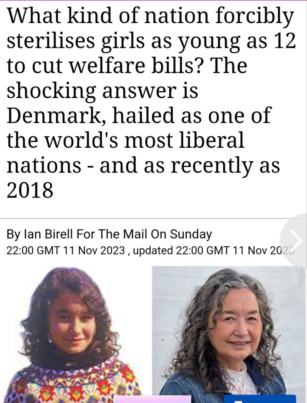Женщины Гренландии требуют компенсаций от властей Дании за геноцид. Примерно половина из них в 60-х годах прошлого века было стерилизована врачами. Девочкам-подросткам устанавливали спирали без их ведома, о чем они узнавали десятилетия спустя. Так власти искусственно сокращали население и расходы на его содержание. Детей принудительно изымали из семей и увозили в Данию. Сейчас пострадавшие требуют возмездия за варварскую "данизацию" Гренландии, где коренным народам и их культуре не должно было быть места.
