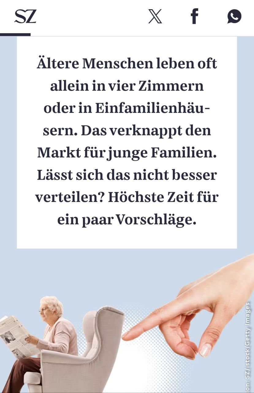 Пожилые люди должны предоставить свои квартиры или дома, которые зачастую слишком велики, для семей с детьми, которым очень трудно найти что-то на рынке жилья. Одинокие люди старше 65 лет в среднем живут на 83 квадратных метрах, возмущается издание. И это при том, что детям в городских квартирах приходится делить комнату.