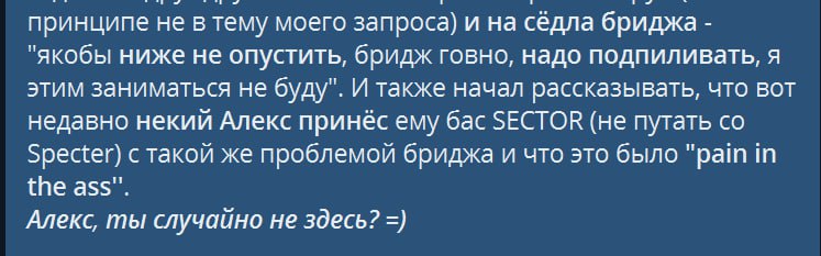 Что у тебя седло в бридже не опускалось. И что бас у тебя Сектор. А я ему принёс Спектор) Я правда никаких секторов нагуглить не смог. Поэтому мне теперь твоя история (с чем пришёл и с чем ушёл) весьма интересна.
