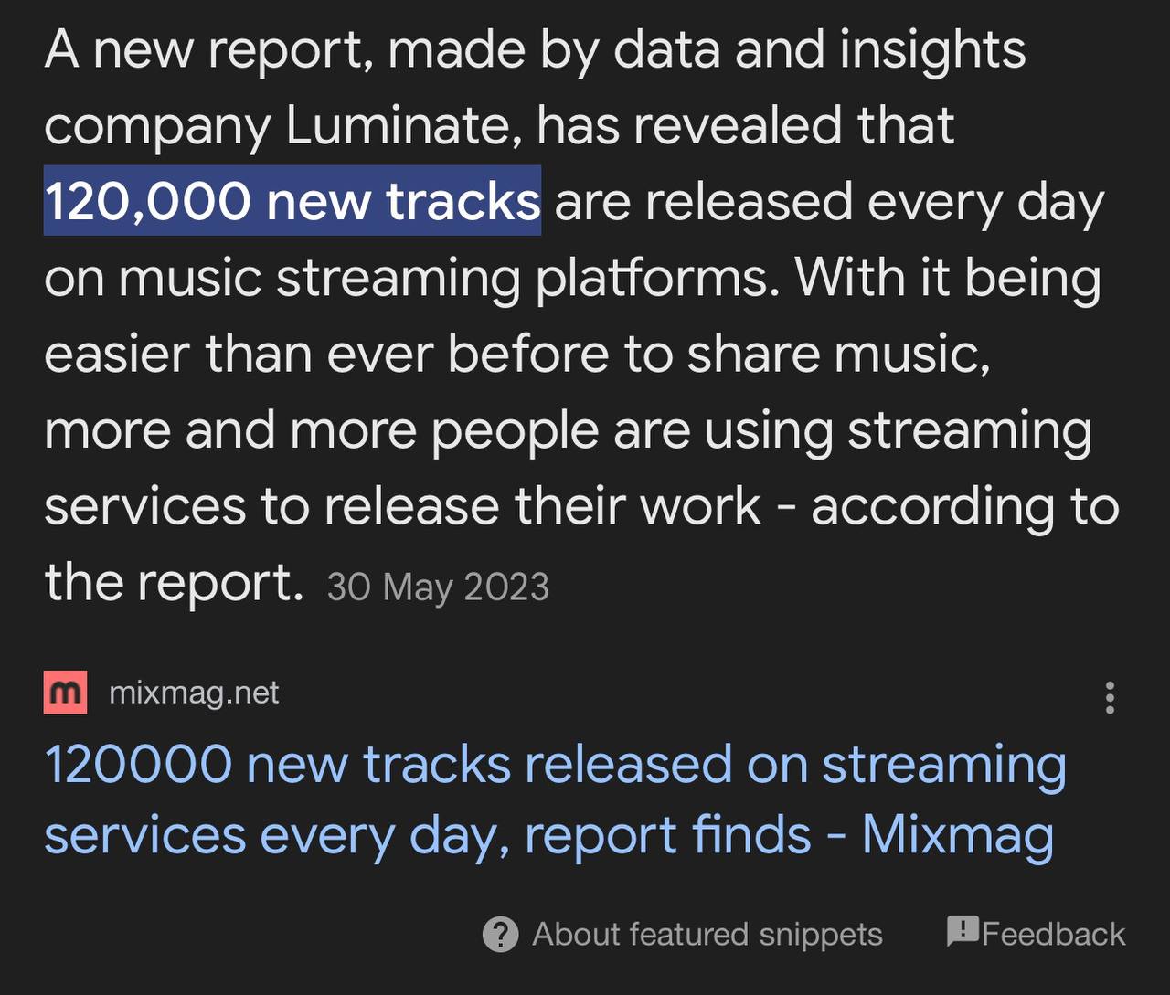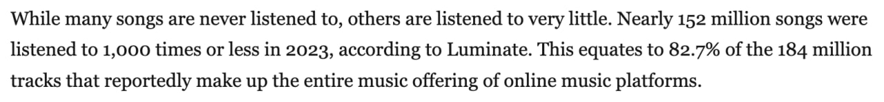 68 милионов треков прослушиваются от 0 до 10 раз, 152 миллиона — от 0 до 1000 раз. Это 83% всей музыки, доступной на стримингах.