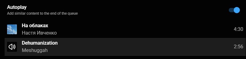 @AnDyFy69Обожаю ютуб мьюзик за очень тонкое понимание стиля играемой им сейчас песни. Всегда можно не сомневаться, что если оставишь вкладку в фоне, следующий трек обязательно будет в тему