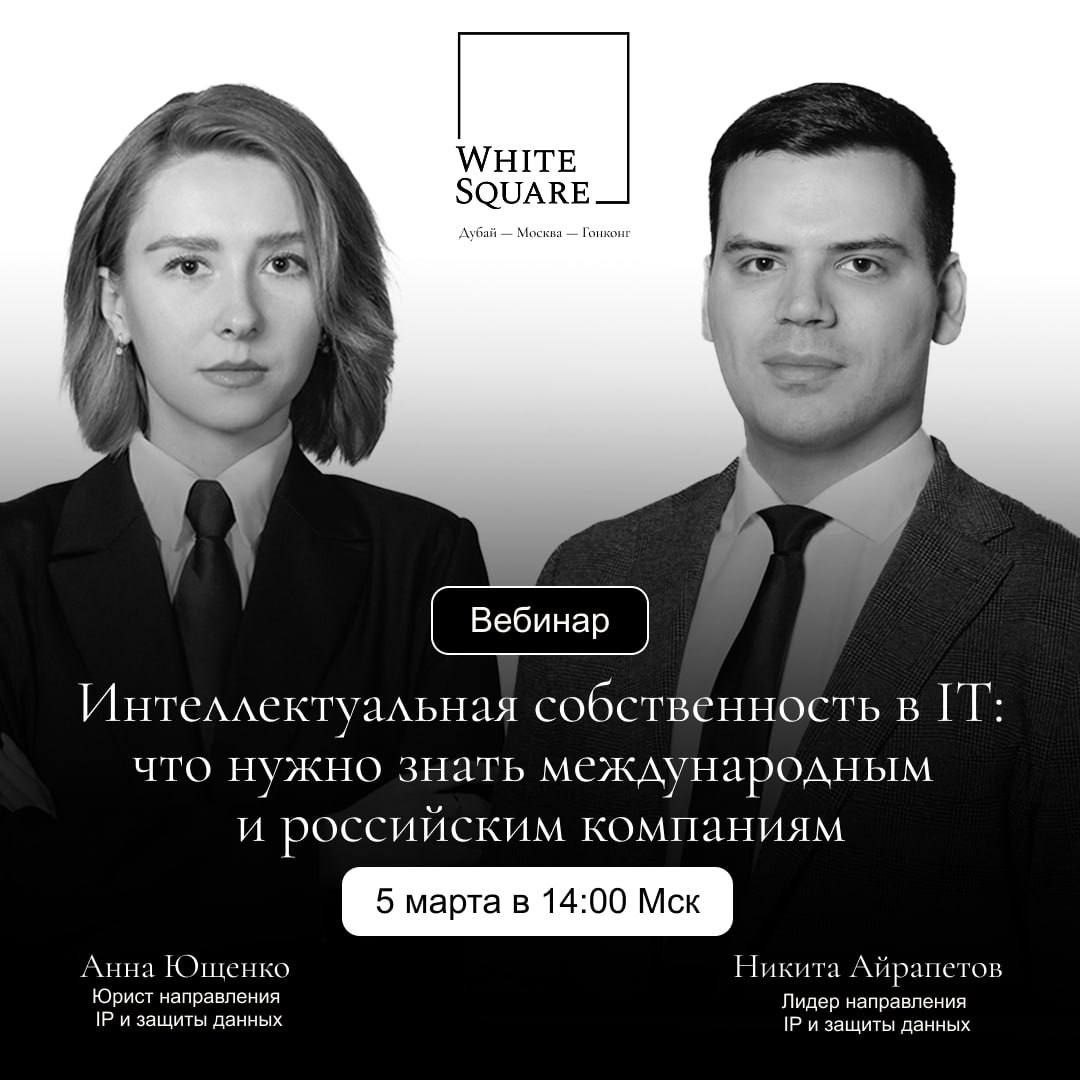 Эксперты White Square на вебинаре «Интеллектуальная собственность в IT: что нужно знать международным и российским компаниям» помогут вам систематизировать всю необходимую информацию, разобраться в актуальных изменениях и избежать дорогостоящих ошибок при защите вашего софта и данных.