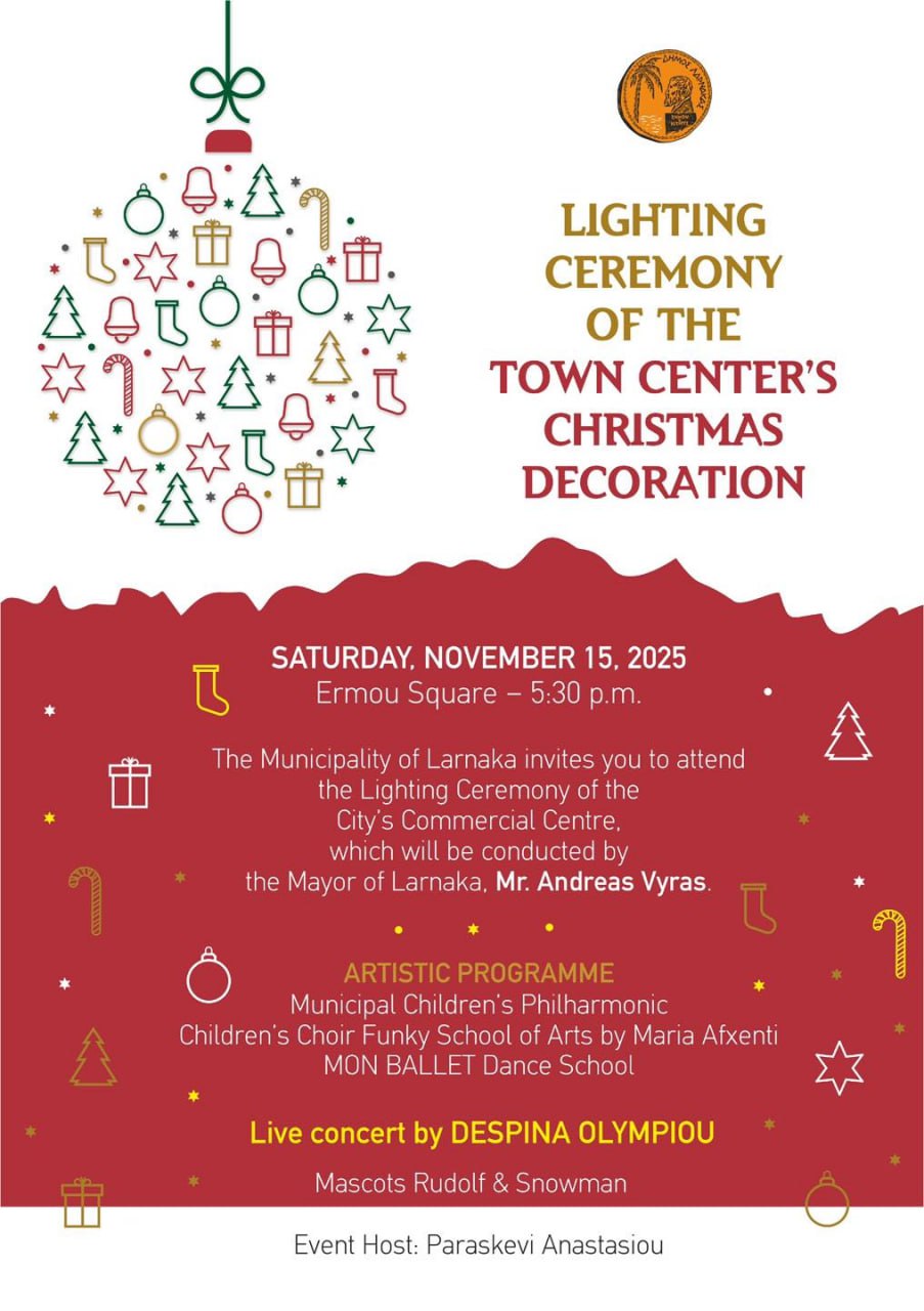 В Ларнаке субботу уже решили создать себе рождественское настроение и в 17:30 на площади Ермоу зажечь елку. Будет выступление детской филармонии и детского хора и танцевальной школы, фото с Снеговиком и Рудольфом и концерт Деспины Олимпиу.