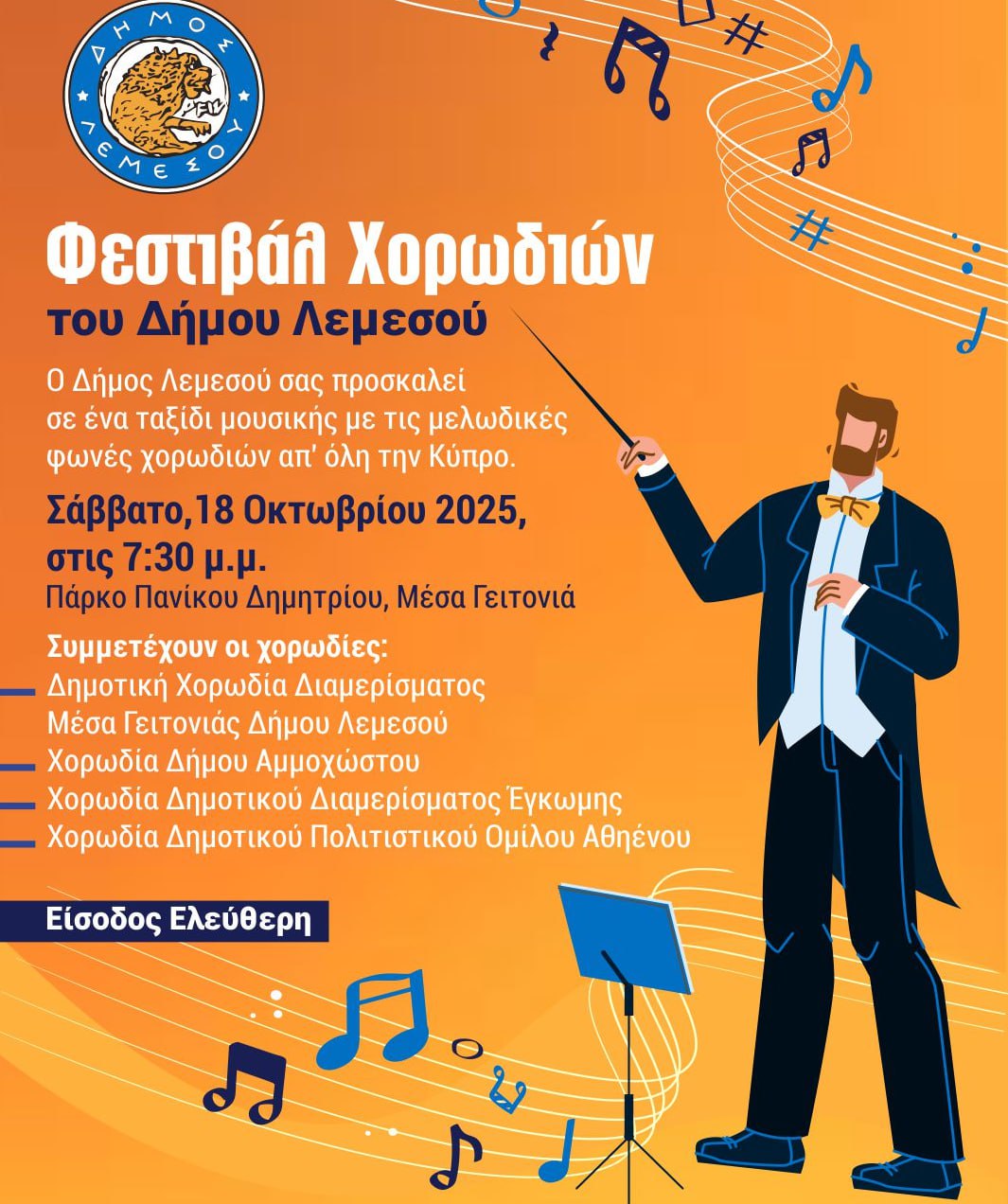 В субботу можно послушать выступления хоров в парке. Участвуют: хор муниципалитета Лимассола, хор Фамагусты, хор Энгоми, хор культурного клуба Афиену.
