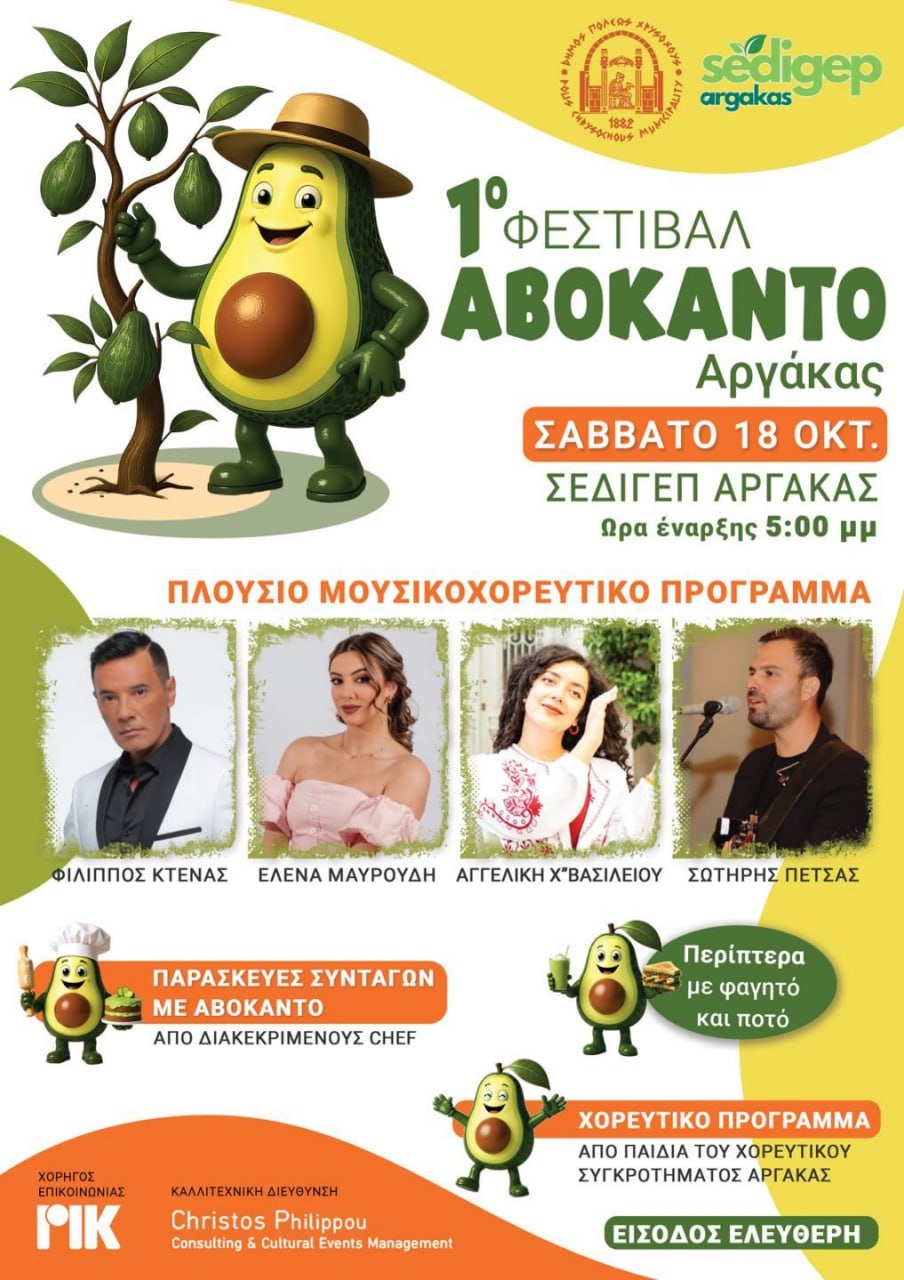 В субботу в небольшой деревне Аргака рядом с Полисом состоится 1-й фестиваль авокадо: танцевально-музыкальная программа, ярмарка, рецепты с авокадо от шеф-повара.