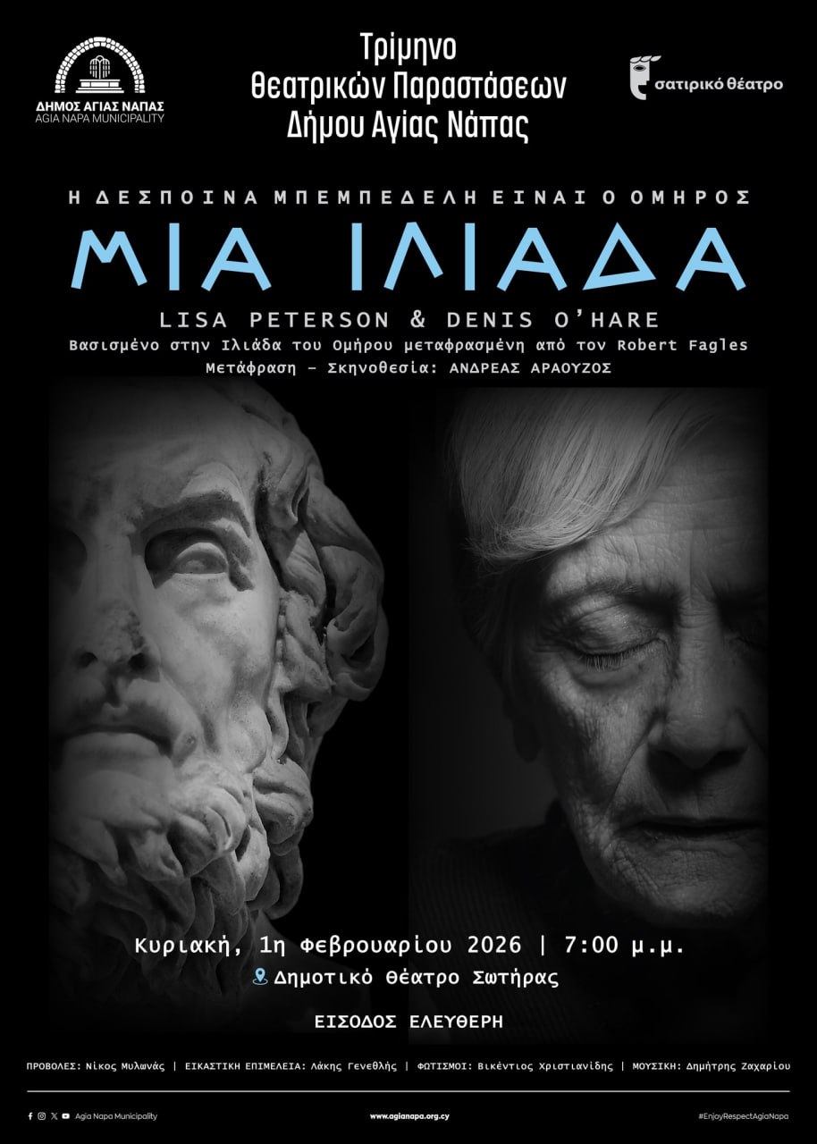 В воскресенье в деревне Сотира под Айя-Напой можно посмотреть сатирический спектакль по пьесе, основанной на произведении Гомера «Илиада». Современная версия прольет свет на вневременные последствия от военных конфликтов для человечества. Поэт расскажет сказку о властолюбии, тщеславии и гордыне.