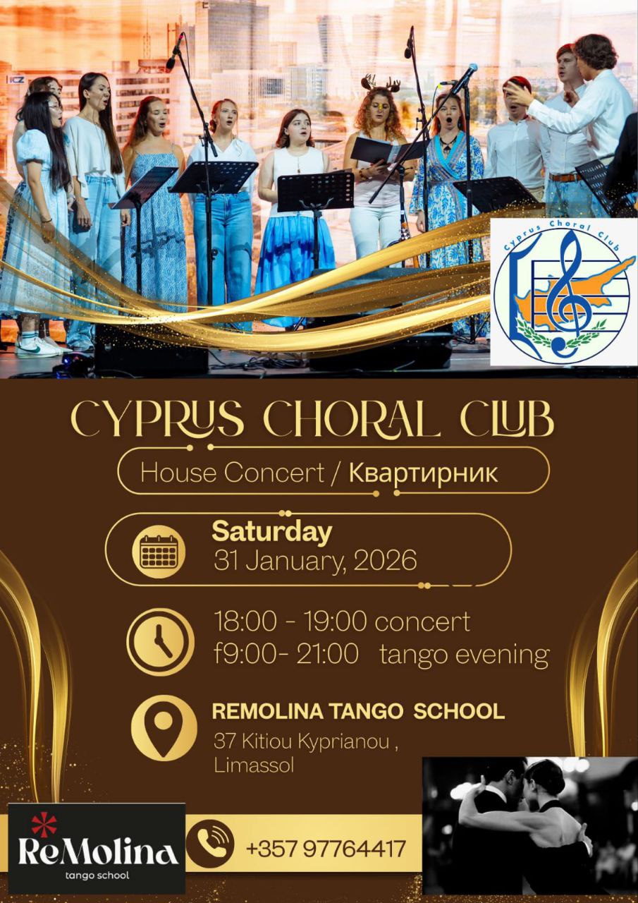 Два интересных события за один вечер. В субботу можно послушать концерт Кипрского Хорового Клуба, а после потанцевать танго.