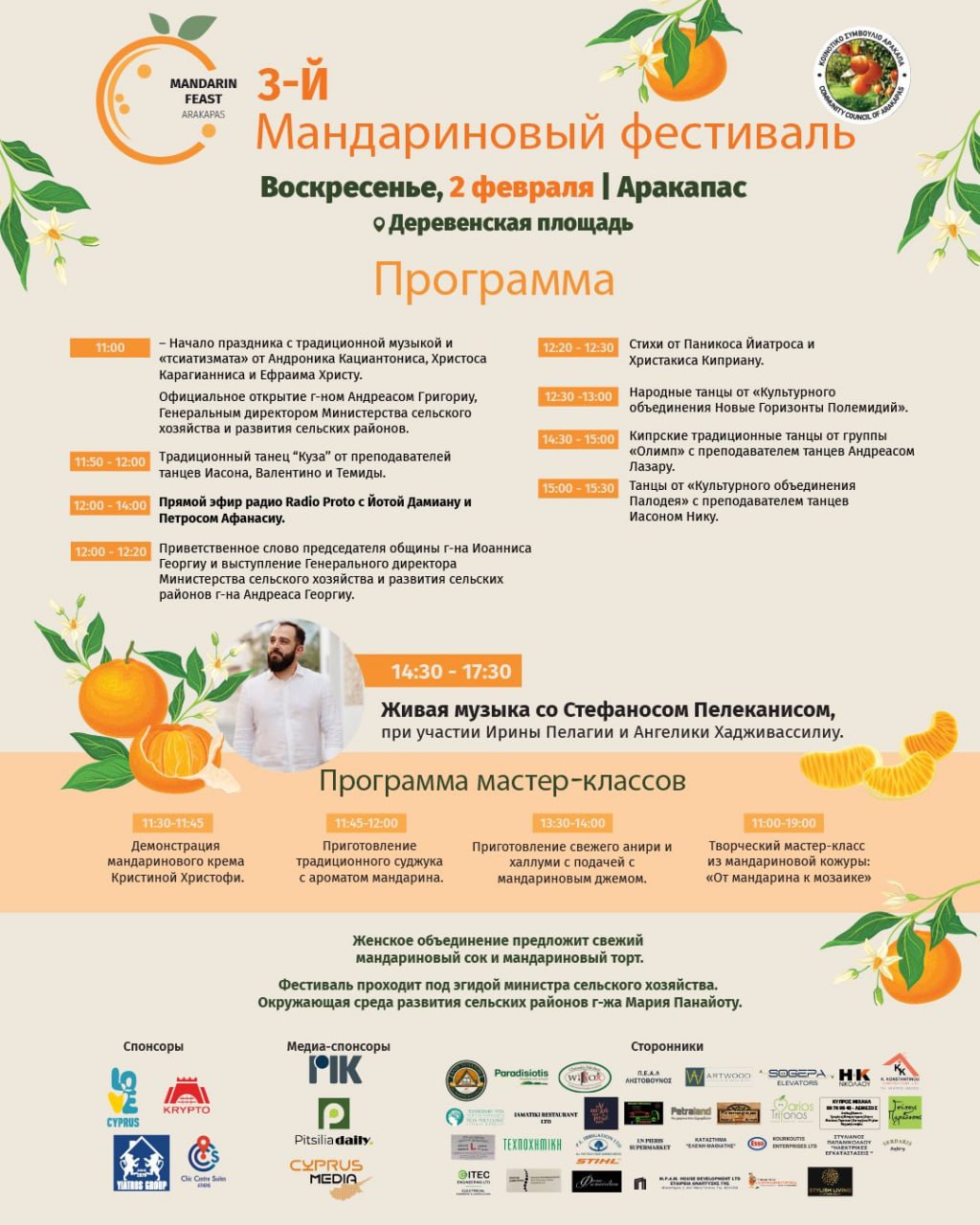 В воскресенье состоится 3-й Фестиваль мандаринов: музыка и танцы 🎶, ярмарка, блюда из мандаринов, мастер-классы по готовке. Организаторы даже заботливо выложили афишу на русском языке (но немного напутали с датой).