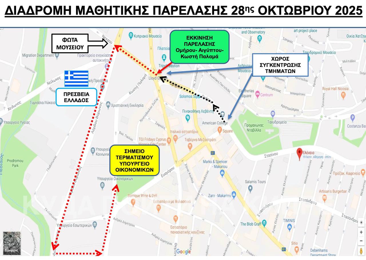 По традиции в этот день перед 📍посольством Греции в Никосии проходит главный парад страны (карта парада на картинке⬆️). Его принимает президент Республики Кипр. Парады с участием ветеранов и школьников также проводят в Лимассоле, Ларнаке, Пафосе, Паралимни, Полисе, Эвриху, Арадиппу, Коккинотримифье и Афиену.