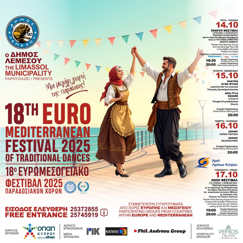На этой неделе пройдет 18-й Европейско-средиземноморский фестиваль традиционных танцев в Лимассоле. Это праздник культуры и традиций, объединяющий народы и ритмы Средиземноморья. Примут участие танцевальные коллективы с Кипра, Греции, Венгрии и Черногории.