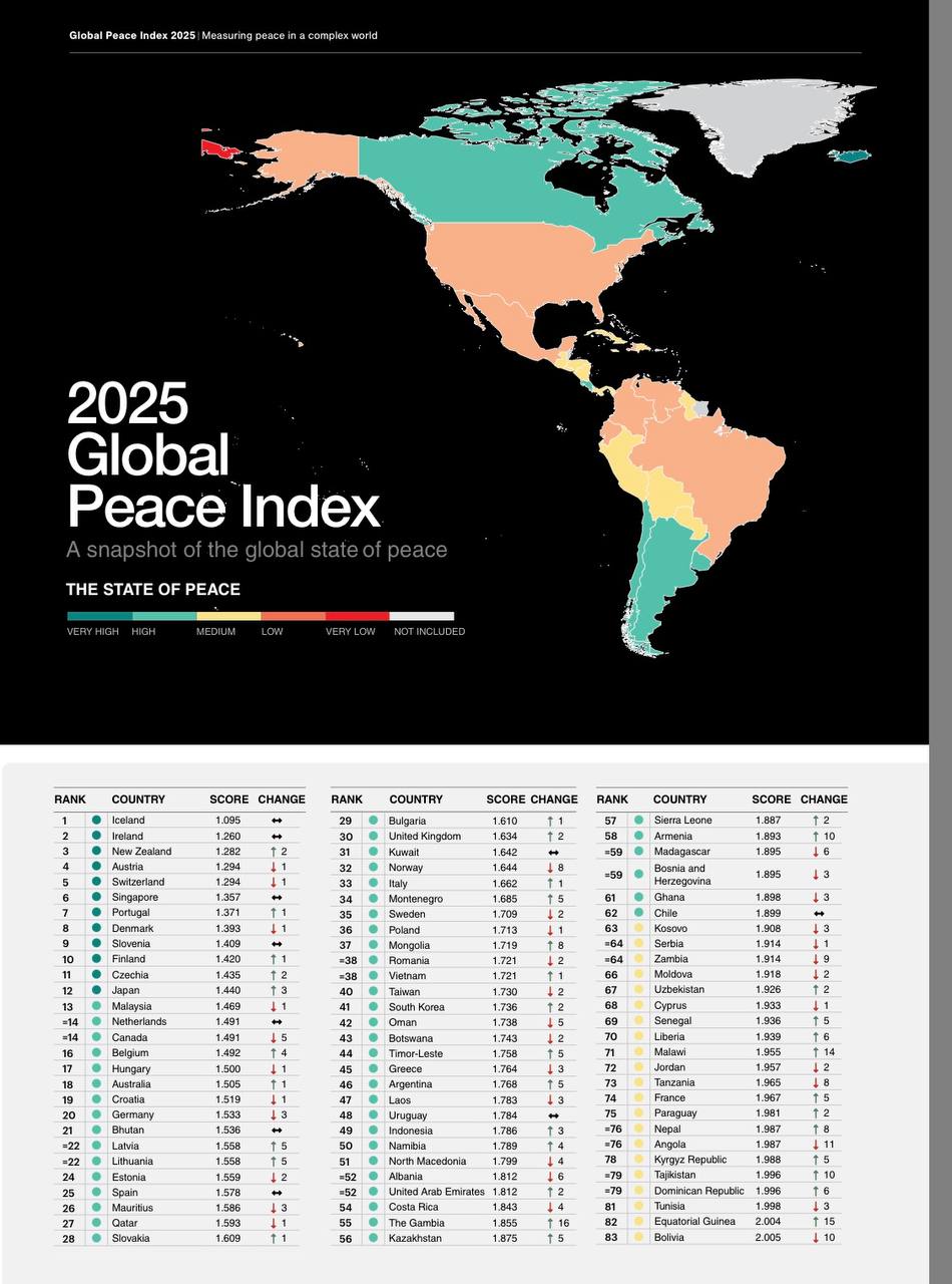 В рейтинге глобального мира (Global Peace Index, GPI), который оценивает уровень миролюбия стран, безопасность, масштабы конфликтов (внутренних и международных) и степень милитаризации, Кипр опустился на одну строчку и занял 68-е место. Четыре региональных соседа Кипра занимают последние 10 мест: Судан, Йемен, Сирия и Израиль. Россия впервые названа наименее мирной страной мира.