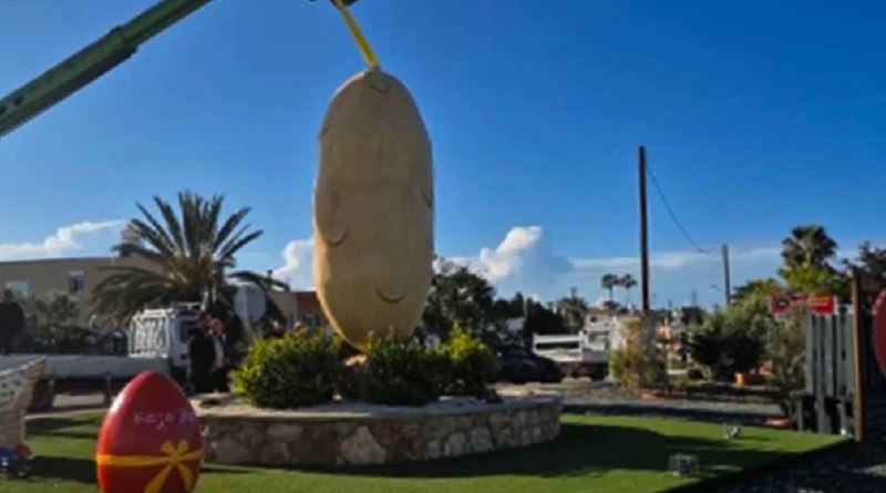 Знаменитая скульптура «Большой картофель» в Ксилофагу вновь установлена после повреждений и ремонта, вызванных сильным ветром, который опрокинул конструкцию в марте.