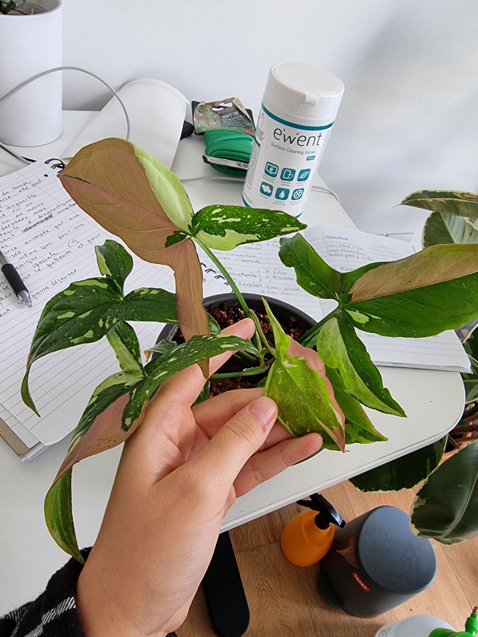 Я когда его только купила, у меня на листьях розовый был только маааленьким пятнышком листа три. Уж думала, что всё, привет. А он внезапно стал снова выдавать розовый на поллиста. На моих тоже бывает, что 1-2 листа бело-зеленые, кстати. Вообще как будто без розового. Но на самом деле, по краю листа каймой все равно есть розовые зоны. Потом розовый как-то рандомно "воскресает")