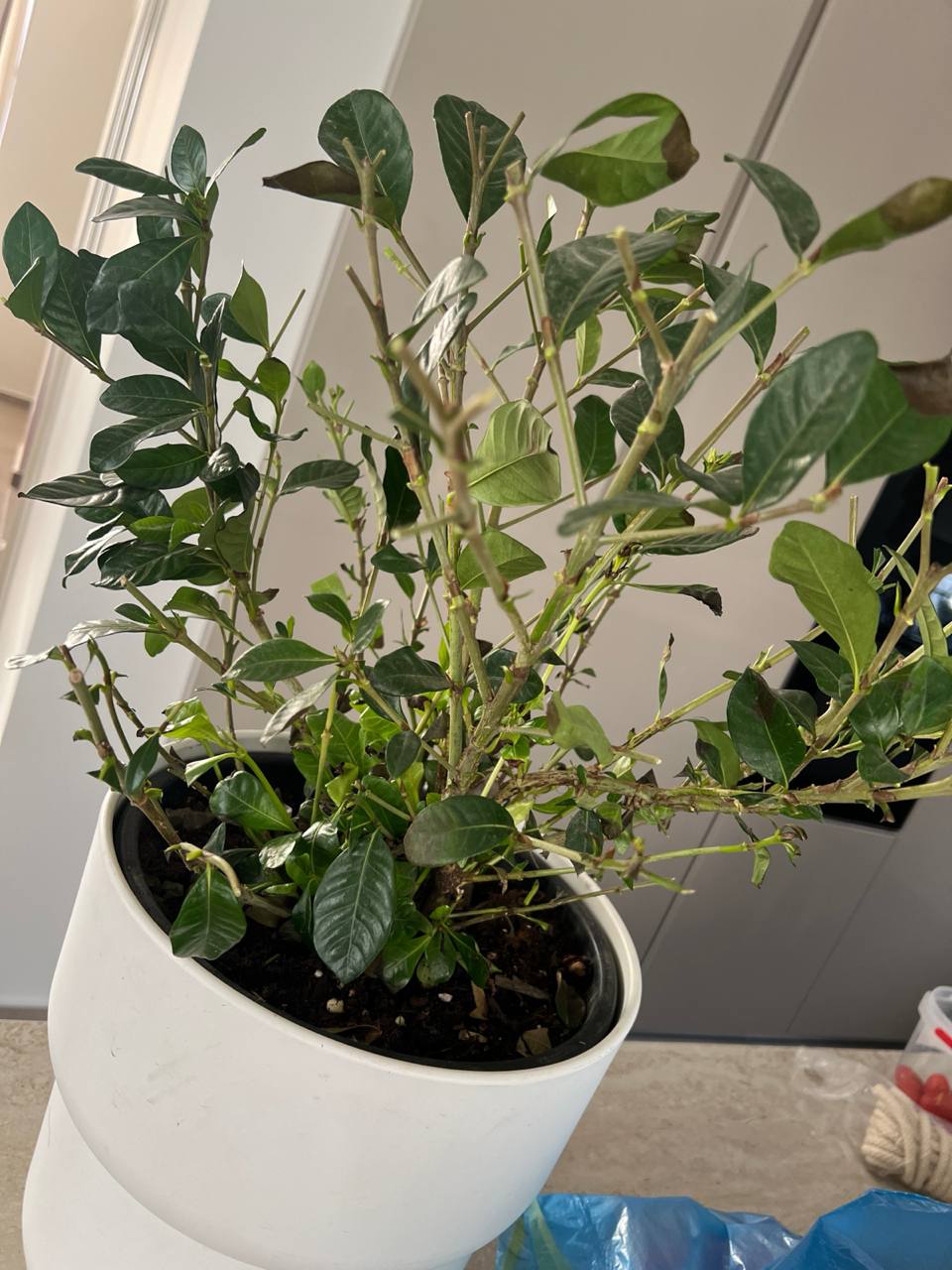 У меня тоже в грунте растёт. Завтра сфотографирую. На солнце целый день. Начали желтеть листья. Мне в садовом центре сказали подкормить железом. Сейчас уже лучше. А то, что продают в кашпо, это гардения жасминовидная обычно. Она очень капризная.