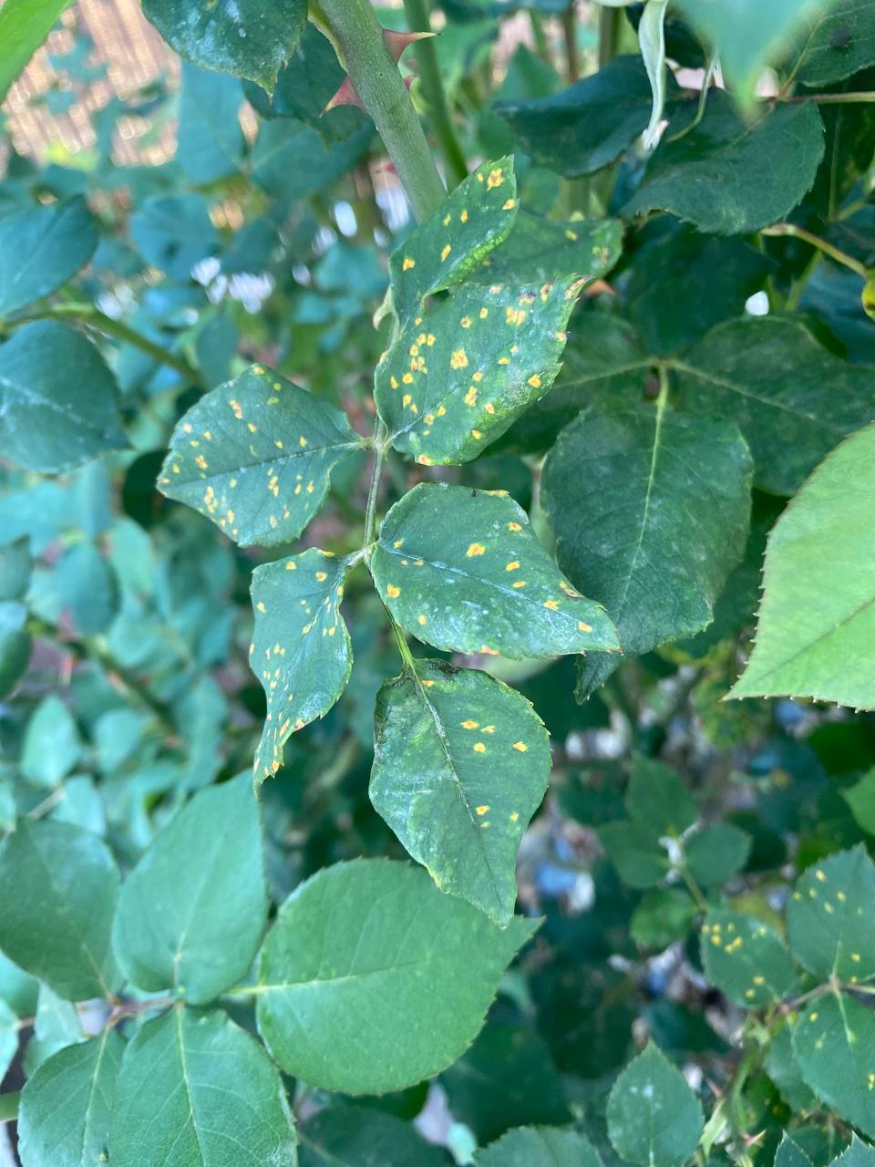 Добрый вечер! На розе вот такое случилось. Что это может быть? Гугл говорит на все жёлтые пятна ржавчина, но фото не похожи