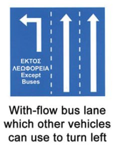 Кстати, именно в Никосии я в первый раз увидел и понял смысл вот этого знака: "обязательно налево, если ты не автобус". В моей книжке пояснений не было. А там наглядно: вот слева автобусная полоса, по ней нельзя, но если тебе надо налево повернуть — то можно, не надо пересекать путь автобусам.