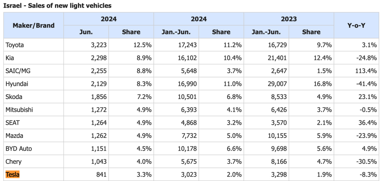 Позвольте прокомментировать. Доля лисинговых машин в Израиле 70%, это машины выдаваемые сотрудникам разных компаний, эти машины, в основном ДВС/гибриды (первые 5 пунктов вашей таблицы) из-за временных сложностей с зарядной инфраструктурой на парковках этих компаний. Такие машины выдают на 3 года, потом меняют на новую. Куда их девают потом, не знаю, скорее всего экспортируют в другие страны. В этом году, компании начали массово пересаживать сотрудников на электро. Сейчас наблюдаются временные трудности с поставкой новых машин из-за войны. Из частных продаж лидируют - Тесла/BYD/Cherry. Если реально посмотреть на дорогах, то каждая третья машина будет Тесла 3-Y/BYD Atto/Cherry Geometry
