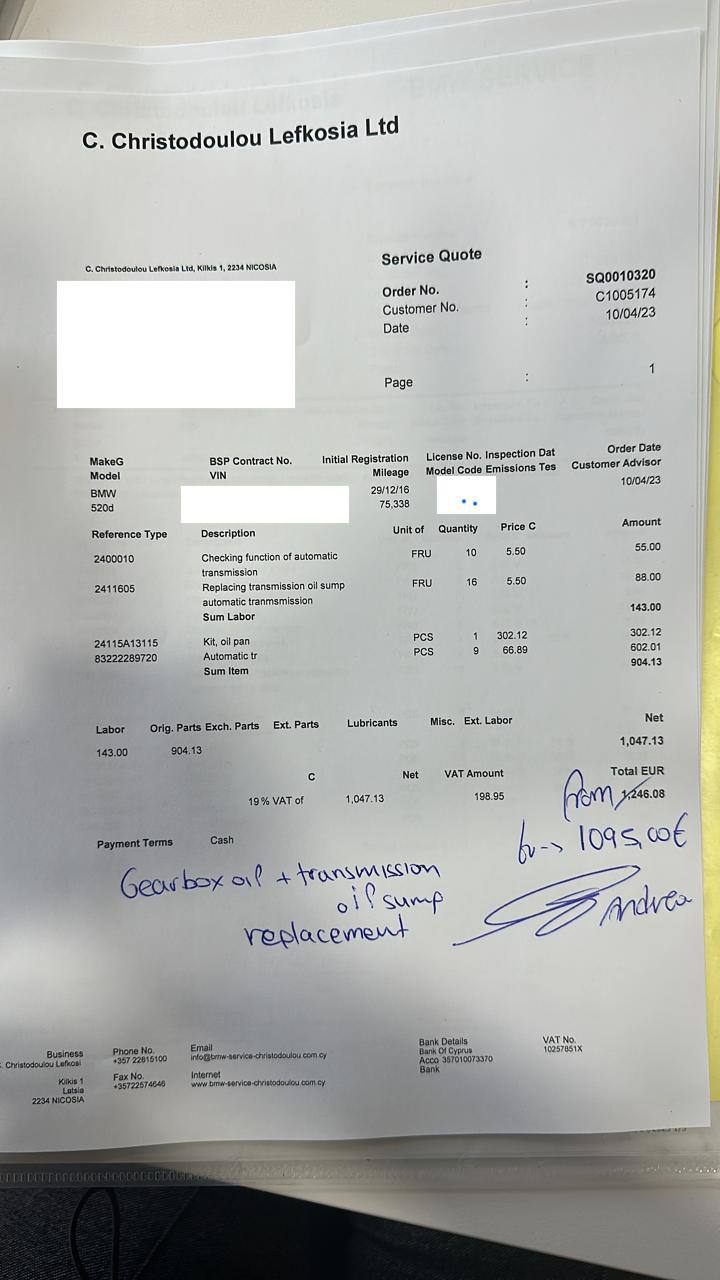 Искал тут где б заменить масло в коробке в bmw 520d, узнал стоимость у вроде как хорошего сервиса в Никосии, цена не очень порадовала 😀😀 Вроде как стоимость работ небольшая, но расходники дорогие.