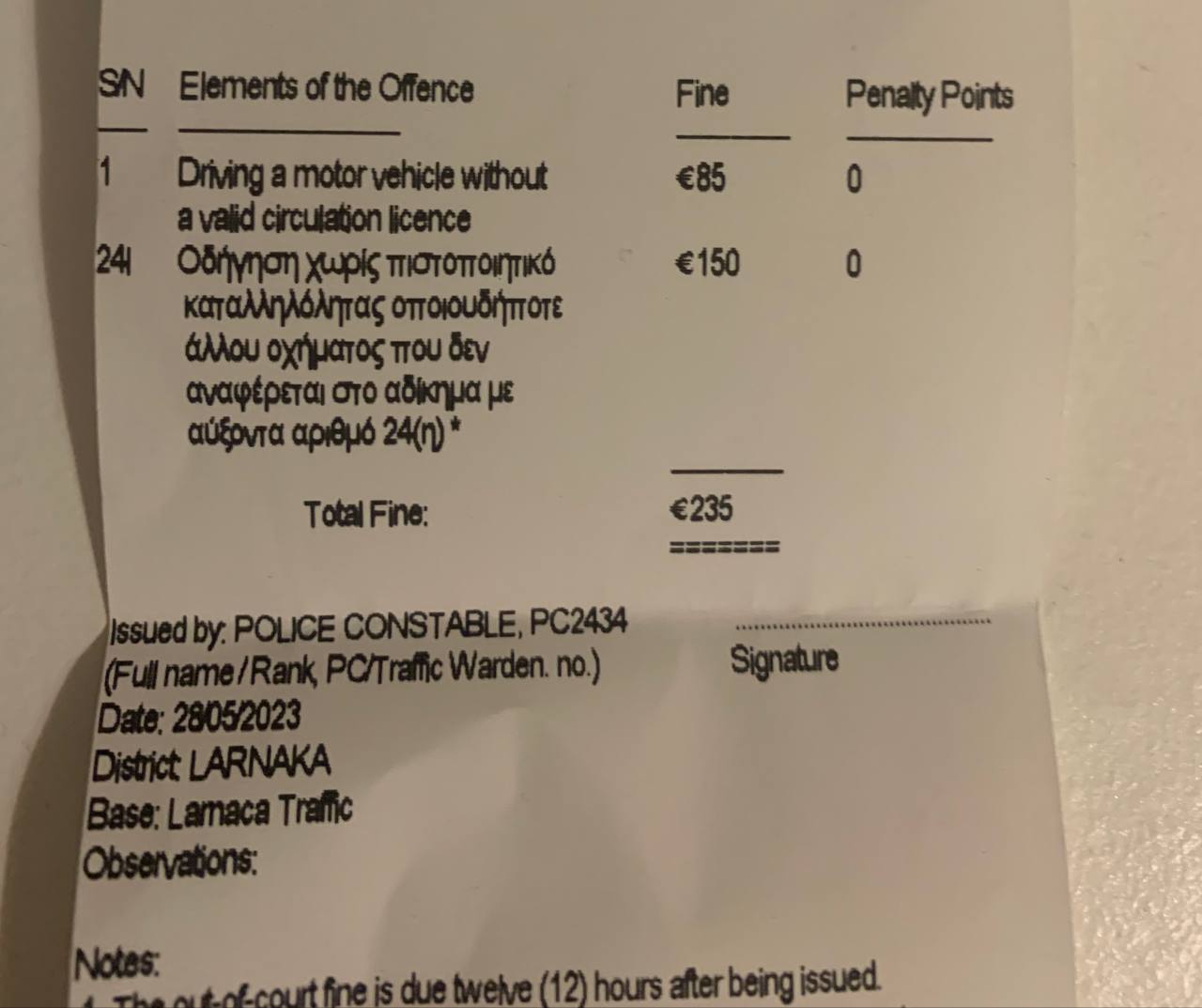Добрый вечер, подскажите пожалуйста за что штраф? Вижу что 85€ за просрочку МОТ, а на греческом переводчик не понимает(