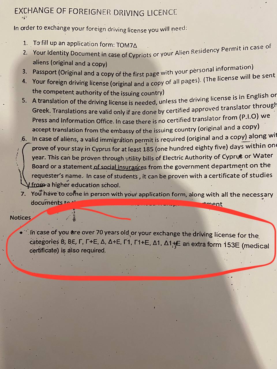 In case of you are over 70 years old or your exchange the driving licence for the categories B, BE, Γ, Γ+Ε, Δ, Δ+Ε, Γ1, Γ1+Ε, Δ1, Δ1+Ε an extra form 153E is also required.