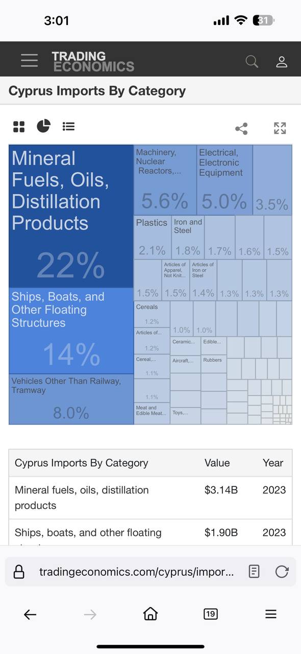 22% в процентах от всего импорта Кипра приходится на продукты нефтепереработки. И основные страны в 23 году были по-прежнему Греция и Израиль. США там не фигурирует. Плюс я не уверен, что Кипру бы разрешили добирать с внешних рынков, в условиях достаточных запасов и стабильной ситуации на европейском рынке.