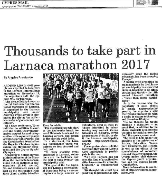На фото — заметка из англоязычной газеты «Cyprus Mail» от 27 октября 2017 года, отражающая ожидания и атмосферу первых лет проведения марафона.