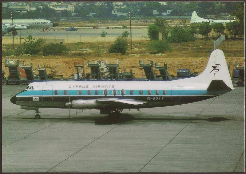 Всего в те годы Cyprus Airways использовала пять арендованных Viscount’ов: G-AZLR (BMA), G-AZLS (BMA), G-AZLT (BMA — именно он на фото), G-AZNB (BMA), G-ARBY (Alidair) — временно заменивших уничтоженный флот.