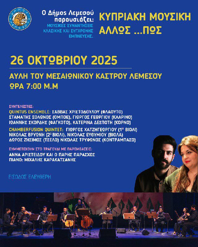Это музыкальная встреча, объединяющая два исключительных коллектива, Quintus Ensemble и ChamberFusion Quintet, которые представят уникальный подход к кипрской музыке через современные и классические аранжировки.