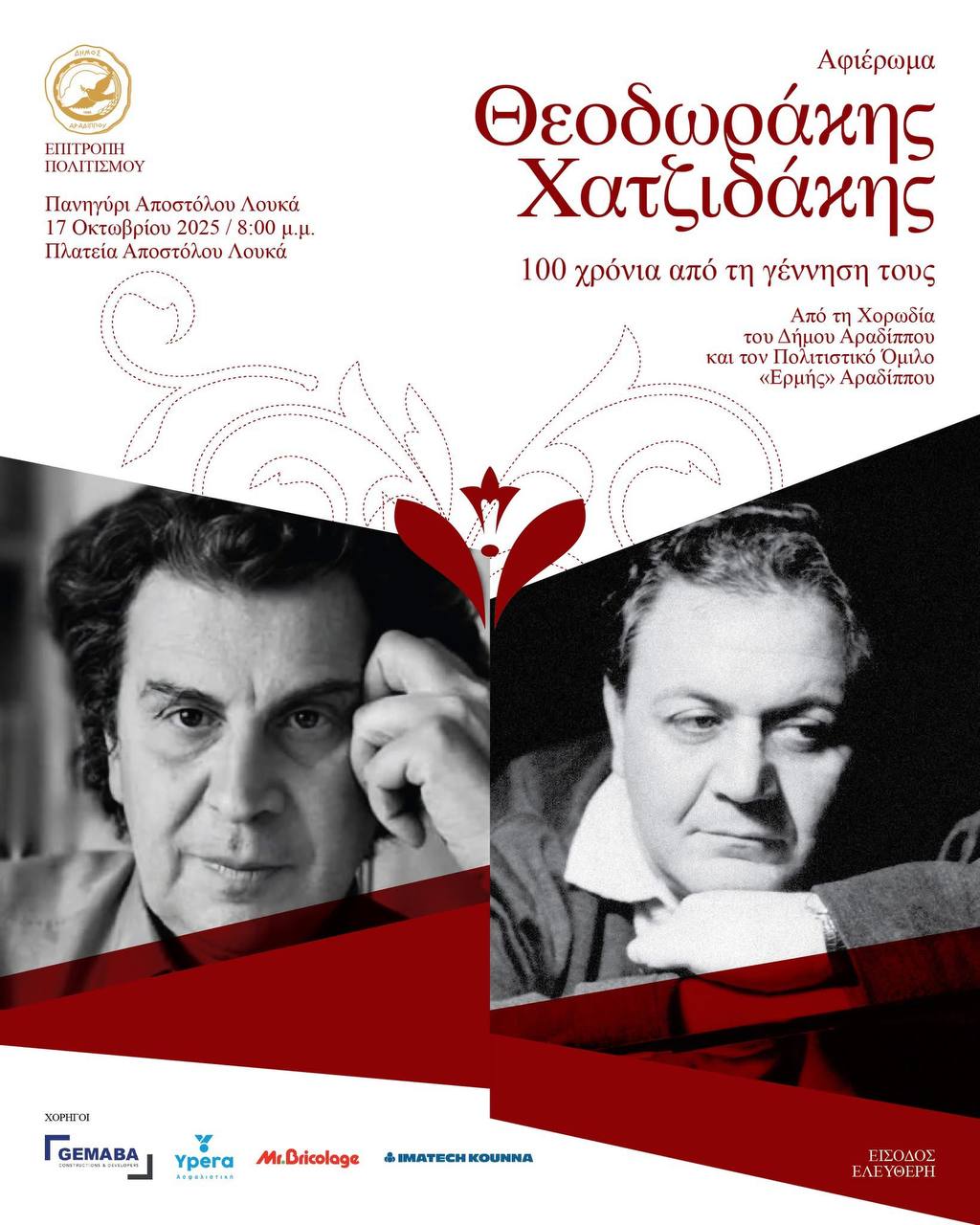Муниципалитет Арадиппу представляет специальное музыкальное посвящение двум ведущим создателям греческой песни, Микису Теодоракису и Маносу Хаджидакису, по случаю 100-летия со дня их рождения.
